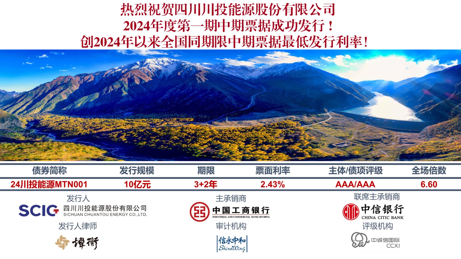 4月16日,川投能源搶抓資本市場(chǎng)有利時(shí)間窗口,成功發(fā)行2024年度第一期中期票據(jù)。本期中期票據(jù)發(fā)行規(guī)模為10億元,發(fā)行期限3+2年,發(fā)行利率2.43%,創(chuàng)2024年以來全國同期限中期票據(jù)最低發(fā)行利率,同時(shí)也創(chuàng)公司中長(zhǎng)期債券歷史最低發(fā)行利率。