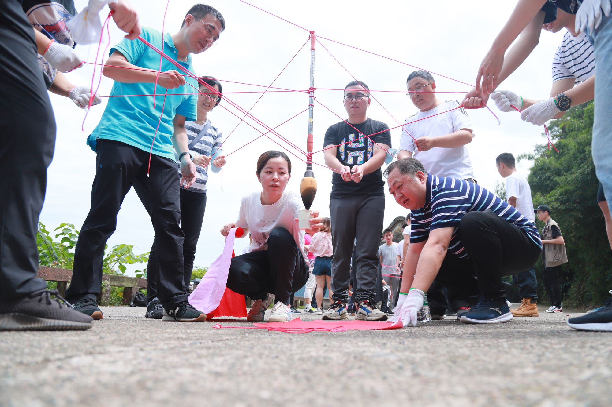 “人心齊,泰山移”。在“書寫傳奇”環節,小組每個成員拉住綁有大毛筆的繩子末端,通力協作配合完成指定書寫文字,深刻啟發大家在工作中不僅要做好崗位工作,恪盡職守,還有學會合理分工,靈活變通,營造互幫互助、唇亡齒寒的全局觀念,為了團隊目標最終達成及時協作調整、鍥而不舍。“流血流汗不流淚,掉皮掉肉不掉隊”。在“飛奪瀘定橋”環節,教練給各組分發隊員人數一半的泡沫墊,要求從起點出發,借助泡沫墊且腳不觸地的情況下,全組隊員“一個都不能少”全數到達終點。各小組以斷金碎石的精神,堅定信念,持續超越;在無障礙溝通的氛圍中感受眾人合力,不斷突破,熔煉團隊。