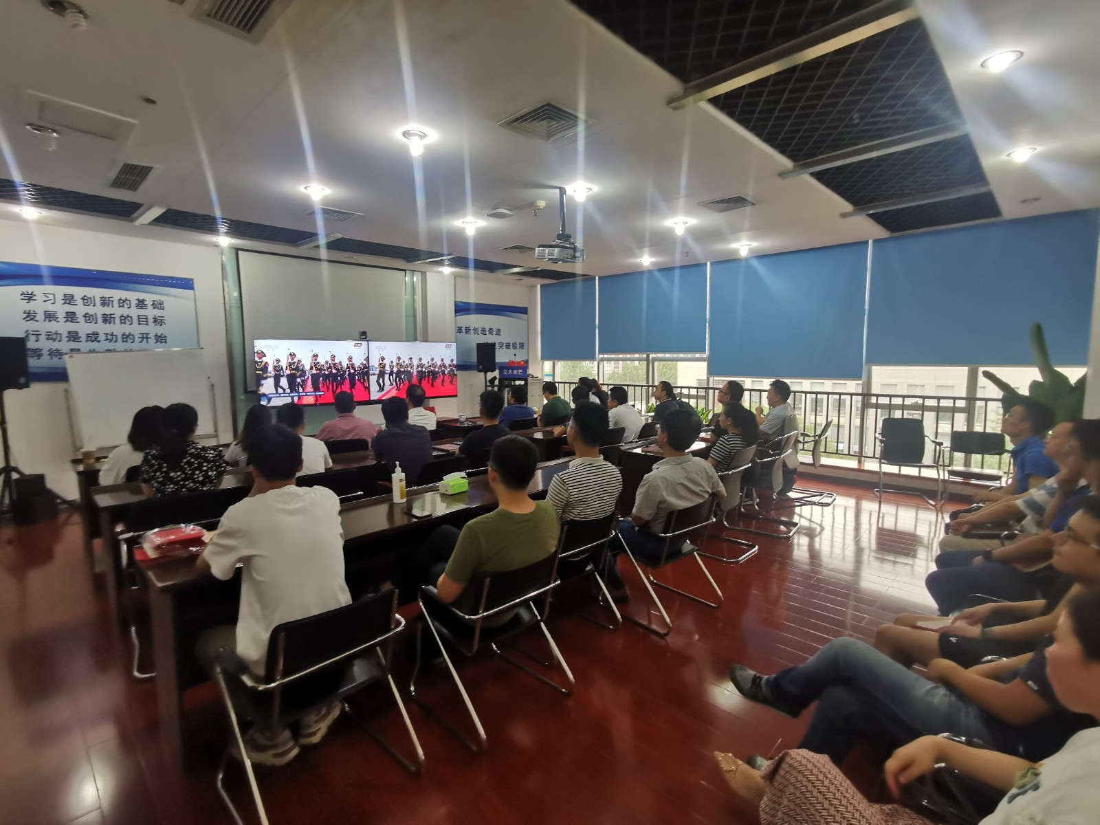視頻中,習近平總書記鏗鏘有力的聲音深入人心,從1921到2021,中國共產黨帶領中國人民,從風雨飄搖中一路走來,百年征程波瀾壯闊,百年初心歷久彌堅。當《國歌》《國際歌》相繼響起的時刻,會場人員紛紛起立,跟隨激昂的旋律整齊高唱。當回顧“四史”贊頌黨的偉業之時,會場人員滿溢出對黨的感恩和身為黨員的自豪。