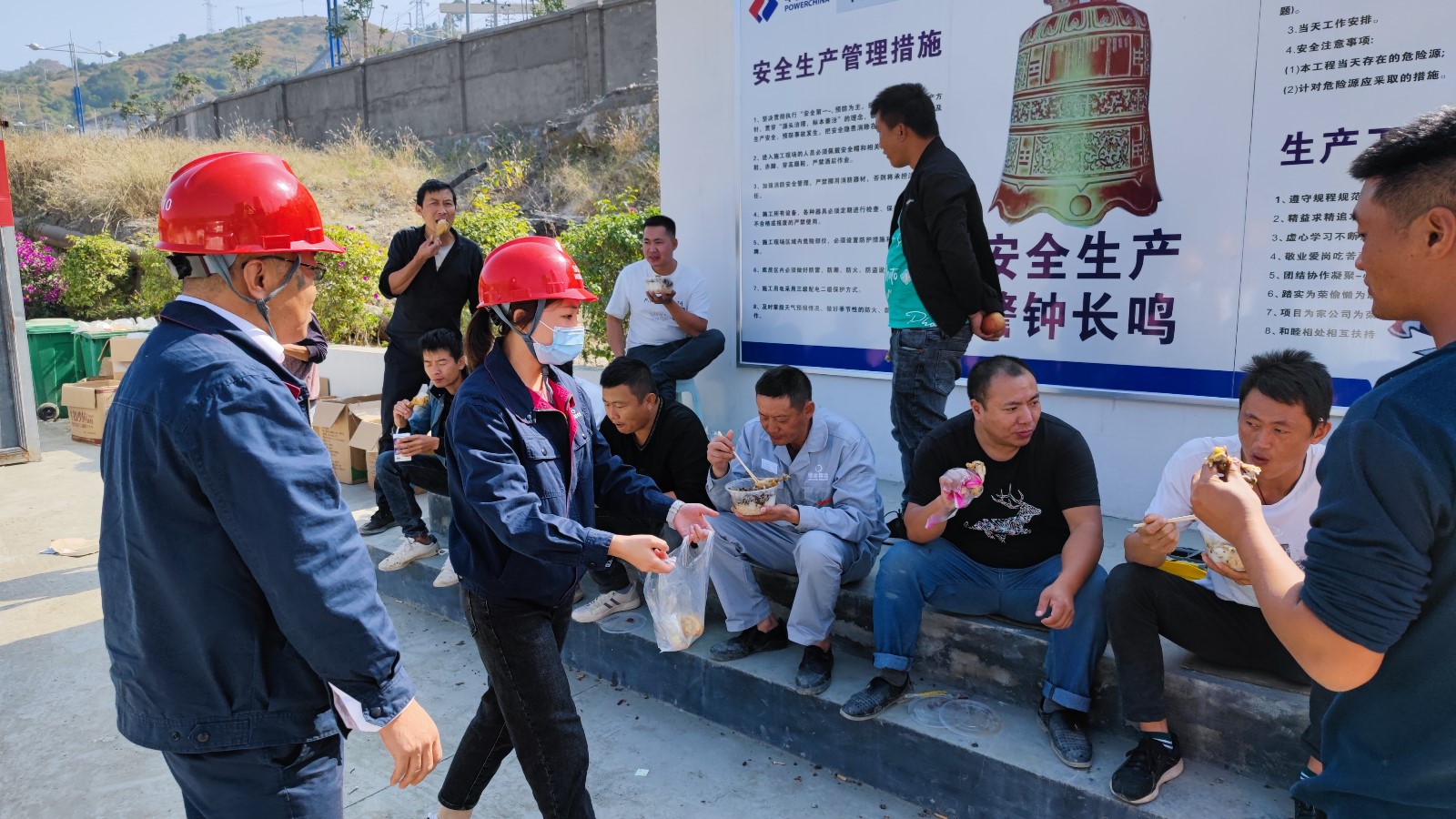 通過近日對施工班組的了解,為確保大江截流的目標(biāo)按期實現(xiàn),工人們中午、晚上用餐都是送到施工現(xiàn)場簡單解決,11月9日,機關(guān)第一黨支部組織了以“工人在加班,我為工人送加餐”的主題黨日活動,組織支部黨員、預(yù)備黨員、入黨積極分子、志愿服務(wù)者共15人到導(dǎo)流明渠施工現(xiàn)場,慰問在施工現(xiàn)場加班加點的一線工人,為他們送去了雞腿、蘋果等慰問品。