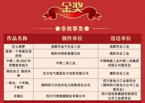 在熱烈慶祝黨的二十大勝利召開(kāi)之際,由四川省總工會(huì)主辦的本次大賽受到了各地市州、央企、國(guó)企的熱烈追捧,選送故事類作品137部,非故事類作品685部。經(jīng)過(guò)初評(píng)初評(píng),共有245部作品入圍終評(píng)。經(jīng)過(guò)專家評(píng)委的綜合評(píng)審,最終評(píng)選出故事類、非故事類作品金獎(jiǎng)各6部、銀獎(jiǎng)各8部、銅獎(jiǎng)各12部,優(yōu)秀獎(jiǎng)各25部。可謂百花齊放、精彩紛呈,競(jìng)爭(zhēng)十分激烈。