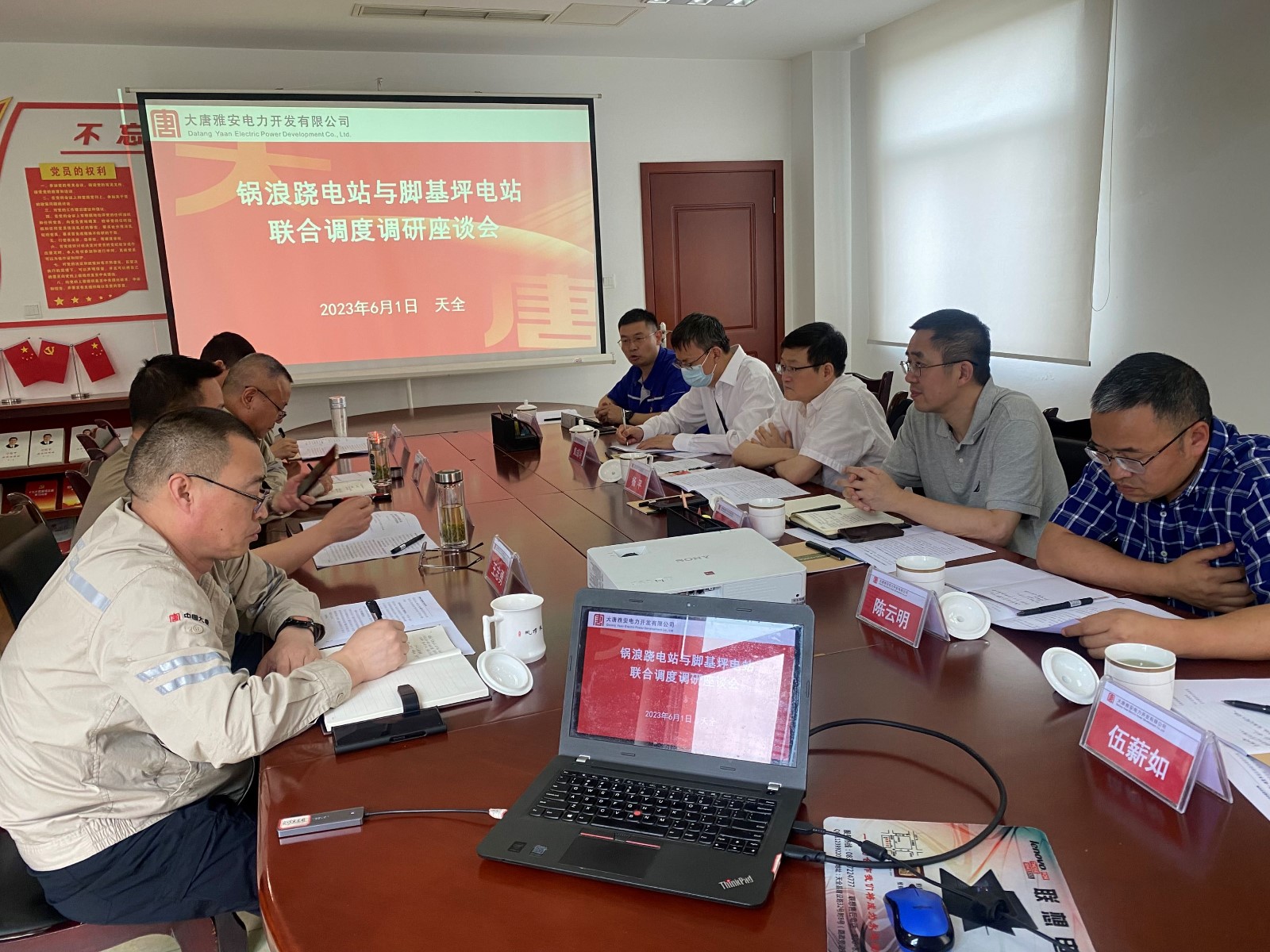 隨后,調研組一行參觀了大唐雅安公司的集控中心并開展座談。大唐雅安公司黨委書記、執行董事任銘對楊平一行表示熱烈歡迎。雙方就兩個公司在天全河流域聯合調度、電力營銷同步化等問題進行了深入探討。任銘表示,大唐雅安公司鍋浪蹺電站作為天全河第一級電站,有年調節能力水庫的優勢,將利用此優勢加強與下游腳基坪電站等流域電站在防洪度汛、電力聯調方面的合作,建立長期友好的合作關系,也對鍋浪磽電站投入前及試運行期間川投能源所轄的腳基坪電站提供的支持表示衷心的感謝。楊平回顧了川投集團、川投能源與大唐公司在嘉陵江亭子口水利樞紐工程項目建設和經營過程中的良好合作,感謝大唐雅安公司在天全河流域防汛、電力調度管理中對腳基坪電站的支持,對兩家公司實現天全河流域上各所屬電站國有資產保值增值充滿信心,希望在今后的電站項目運營管理、防洪度汛、新能源項目開發等方面繼續保持與大唐公司的良好溝通,并歡迎大唐公司到川投能源所屬各個水電項目指導工作。雙方工作層面就聯合調度、防汛的各個環節進行了具體的溝通交流。