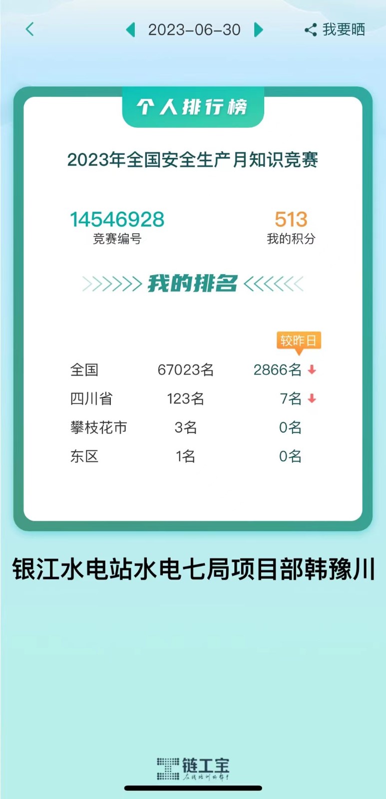 在“鏈工寶”2023年全國安全生產月知識競賽活動中,攀枝花市前10名中,銀江水電站占3人,東區前10名中,銀江水電站占6人,有效檢驗了安全生產月活動成果,充分體現了銀江水電站學安全、講安全的濃厚安全生產氛圍,進一步強化了廣大工程參建人員的安全生產意識。