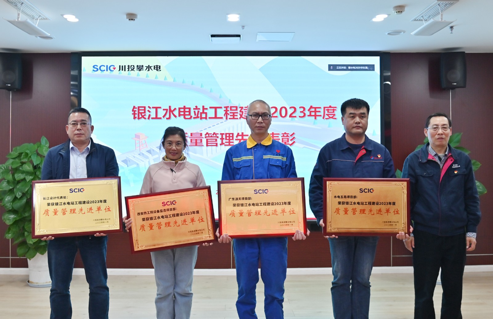 會上,公司副總經理唐伽宣讀了《關于表彰銀江水電站2023年度質量管理先進單位、先進集體和先進個人的通報》文件,徐孝剛向榮獲2023年度質量管理先進單位的長江設計代表處、西安熱工院設備監造項目部、水電五局項目部、廣東源天項目部頒發了獎牌;公司黨總支副書記、董事會秘書、工會主席鄧勇,公司黨總支委員、紀檢小組長楊銳向榮獲先進集體的長江設計代表處壩工專業組、貴陽院監理部土建工程管理部、西安熱工院設備監造項目部駐哈電監造站、水電七局項目部砂石工區、水電五局項目部土建三隊、廣東源天項目部主機班等13個集體頒發了獎牌。徐孝剛向獲獎的單位、集體及個人表示了祝賀,要求他們在今后的質量管理工作中發揮好先鋒模范帶頭作用,促進各參建單位共同提高質量管理水平,把銀江水電站建設成“精品工程、樣板工程、陽光工程”。