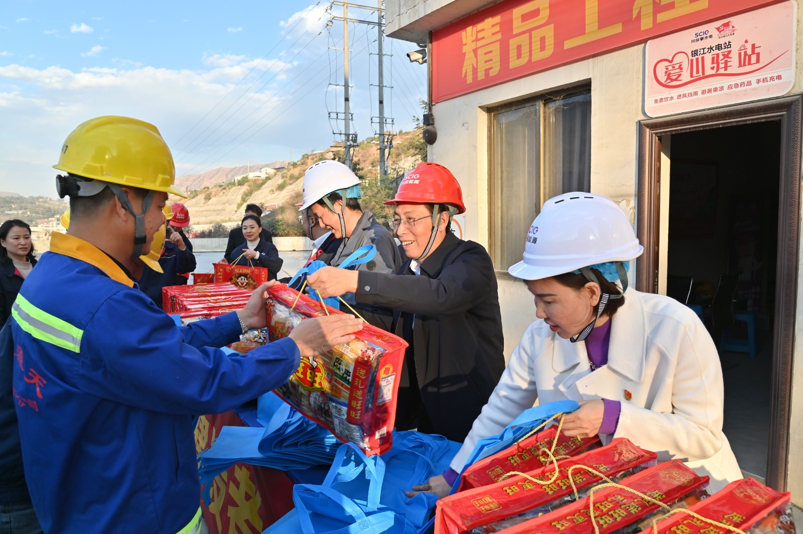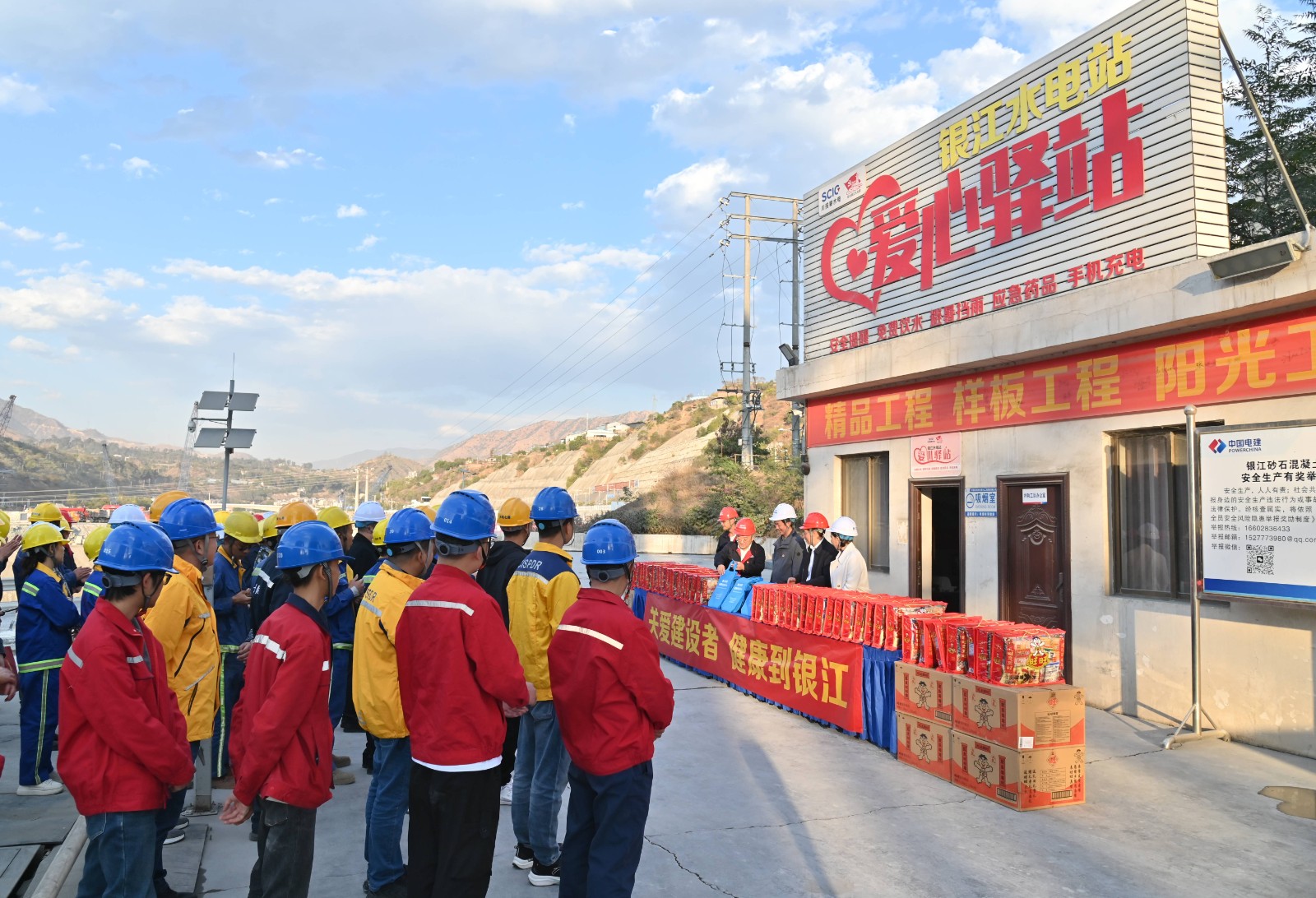 活動首先參觀了公司大黨建宣傳陣地和銀江水電站施工現場。在愛心驛站,黨員們為來自長江設計院、貴陽院監理部、水電五局項目部、水電七局項目部、廣東源天項目部等參建單位的工友發放了健康宣傳手冊、新春大禮包等慰問物品。田巨龍感慨到銀江水電站工程建設速度之快難以令人想象,囑咐工友們一定要保重身體、注意自身防護,祝福工友們平平安安、健健康康迎接新年的到來。