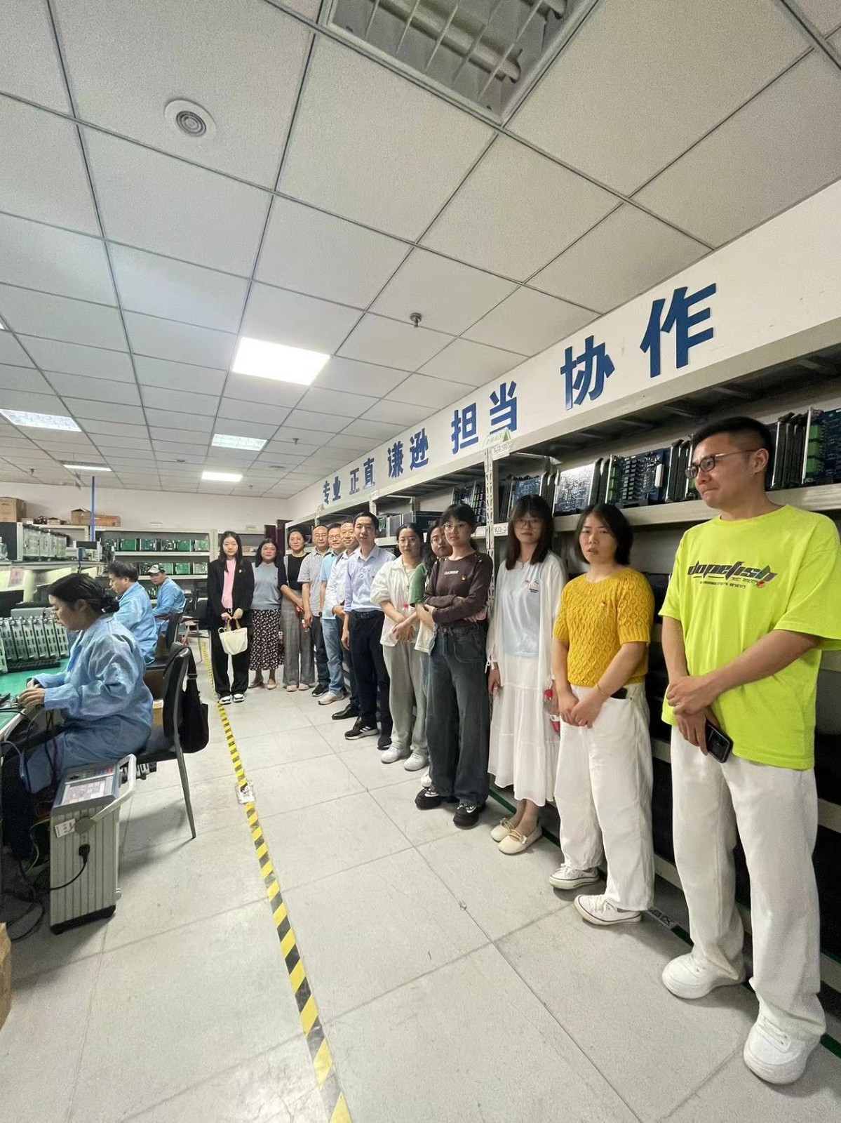 隨后,邀請生產車間主任夏佐平向大家介紹公司產品的生產過程,全體黨員到模板調試、裝置裝配、總裝車間現場實地參觀,通過交流,詳細了解在生產調試中需要注意的細節,身臨其境深化對產品生產過程、質量控制的認識。