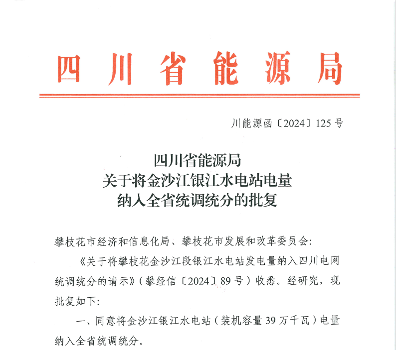 8月27日,在四川省能源局、攀枝花市有關部門和川投能源的指導幫助下,經過積極對接、多方協調,攀水電公司成功取得四川省能源局將銀江水電站電量納入全省統調統分的批復,為實現銀江水電站2024年首臺機組投產發電目標再增“助推器”。