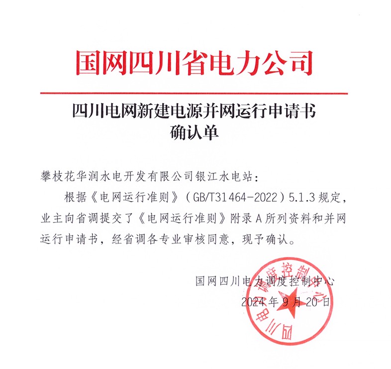9月20日,在國網四川省電力公司和川投能源的指導幫助下,經過積極對接、多方協調,攀水電公司成功取得銀江水電站新建電源并網運行申請書確認單,標志著銀江水電站具備并網手續辦理的資格條件。