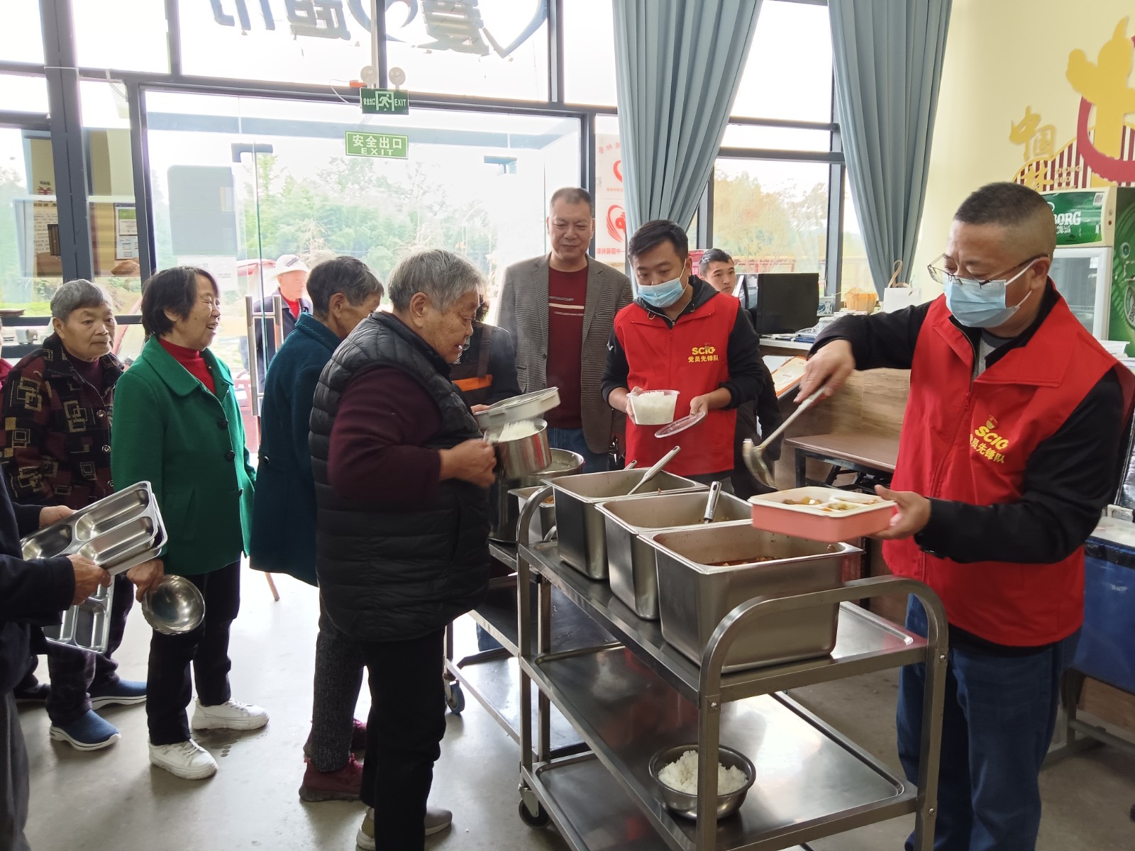 井然有序的活動現(xiàn)場,身著醒目紅色馬甲的黨員們迅速分工、密切合作,有的拿起掃帚、拖把和抹布開展衛(wèi)生清潔,從地面到墻面、從桌椅到餐具的每一個(gè)角落,為老人們營造整潔舒適的就餐環(huán)境;有的為行動不便的老年人及時(shí)送餐上門,讓他們能心情愉悅地享用美食;有的則陪伴在老人身邊與他們親切交談,關(guān)愛他們的健康與需求,傾聽他們的心聲與故事。“爸媽食堂”內(nèi)忙碌穿梭的黨員身影,構(gòu)成了一幅幅溫馨動人的畫面。