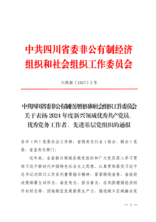 近日,中共四川省委非公有制經濟組織和社會組織工作委員會印發《關于表揚2024年度新興領域優秀共產黨員、優秀黨務工作者、先進基層黨組織的通報》,川投能源黨委交大光芒黨總支獲評“四川省2024年度新興領域先進基層黨組織”稱號。