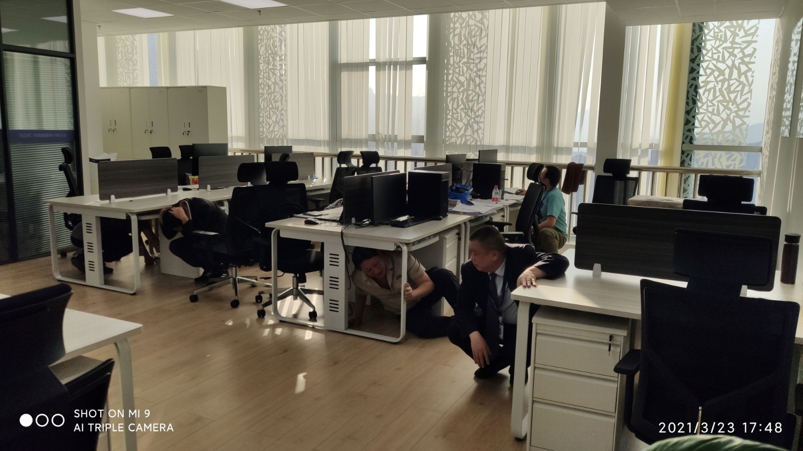 同日下午,攀水電公司在鋼城經貿大廈A座辦公樓(26樓)會議室進行了地震災害疏散演練培訓。演練開始前,組織觀看了地震災害應急知識短視頻,并介紹講解了辦公樓緊急疏散通道和疏散路線,強調了避震原則以及緊急避震、緊急疏散、緊急搶救相關知識與注意事項。17點45分05秒,模擬演練發(fā)生4.8級地震,震源深度為12公里,震感強烈,各參演人員按照緊急避震原則,采取低頭、蜷曲身體、爬入辦公桌下等有利于避震的方式防護身體重要部位。主震結束后,公司第一時間啟動應急響應,立即組織各參演人員按照既定的疏散路線安全撤離到達指定區(qū)域。