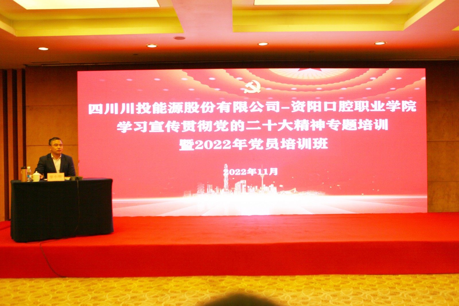 為深入學習宣傳貫徹黨的二十大精神,鞏固拓展黨史學習教育成果,不斷夯實全體黨員忠誠擁護“兩個確立”、堅決做到“兩個維護”的政治自覺、思想自覺、行動自覺,11月21日-22日,川投能源黨委與資陽口腔職業學院黨委共同舉辦學習宣傳貫徹黨的二十大精神專題培訓暨2022年黨員培訓班。川投能源黨委書記、副董事長、總經理楊洪出席并授課,資陽口腔職業學院黨委書記、理事長張中偉出席并作開班講話,川投能源黨委副書記、工會主席冉蘭平主持開班儀式。